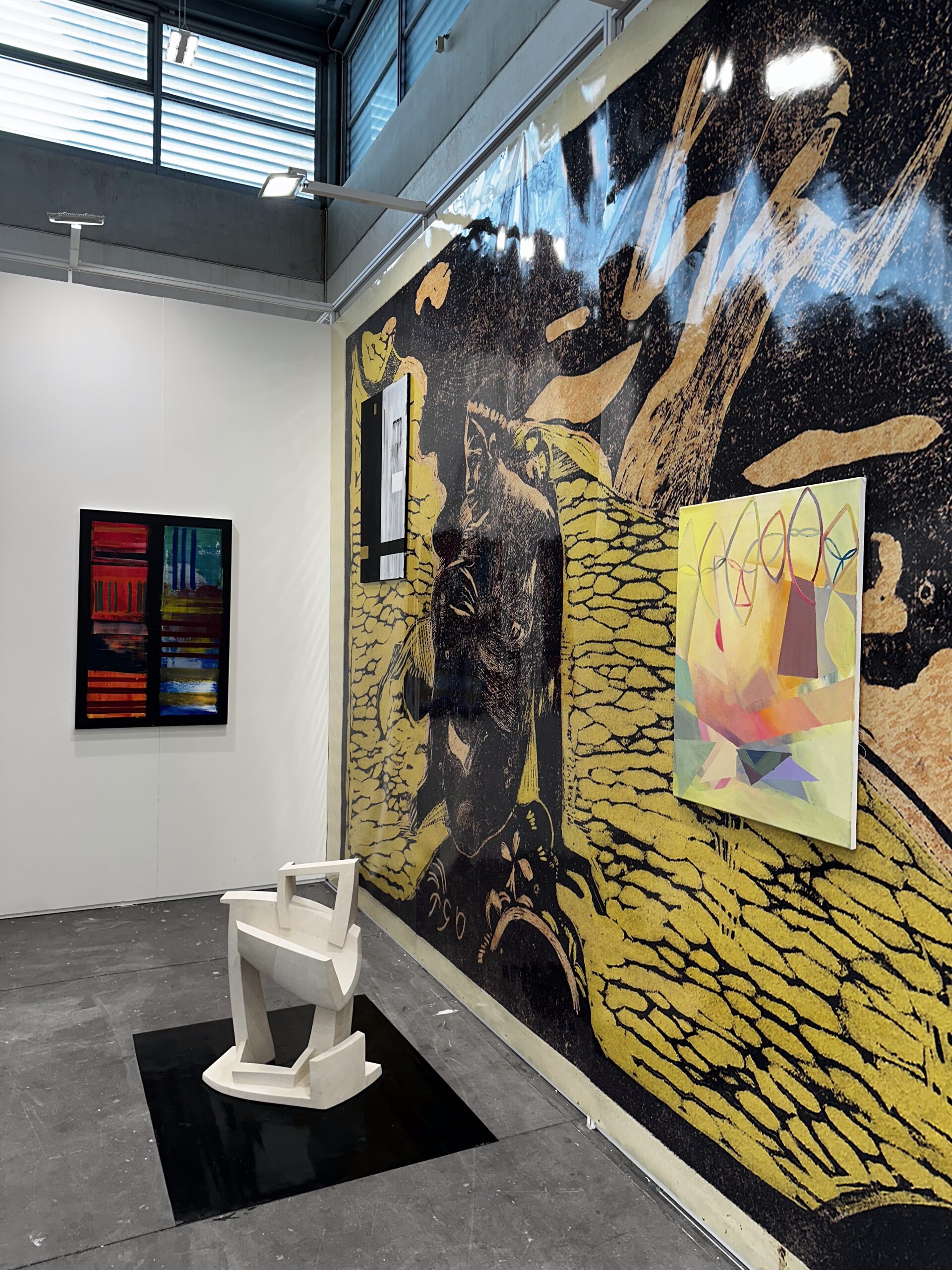 Chuck Drake, on the other hand, travels back in time in his own memory, rediscovering shapes and colors that he recomposes in his paintings in formally composed compositions that are