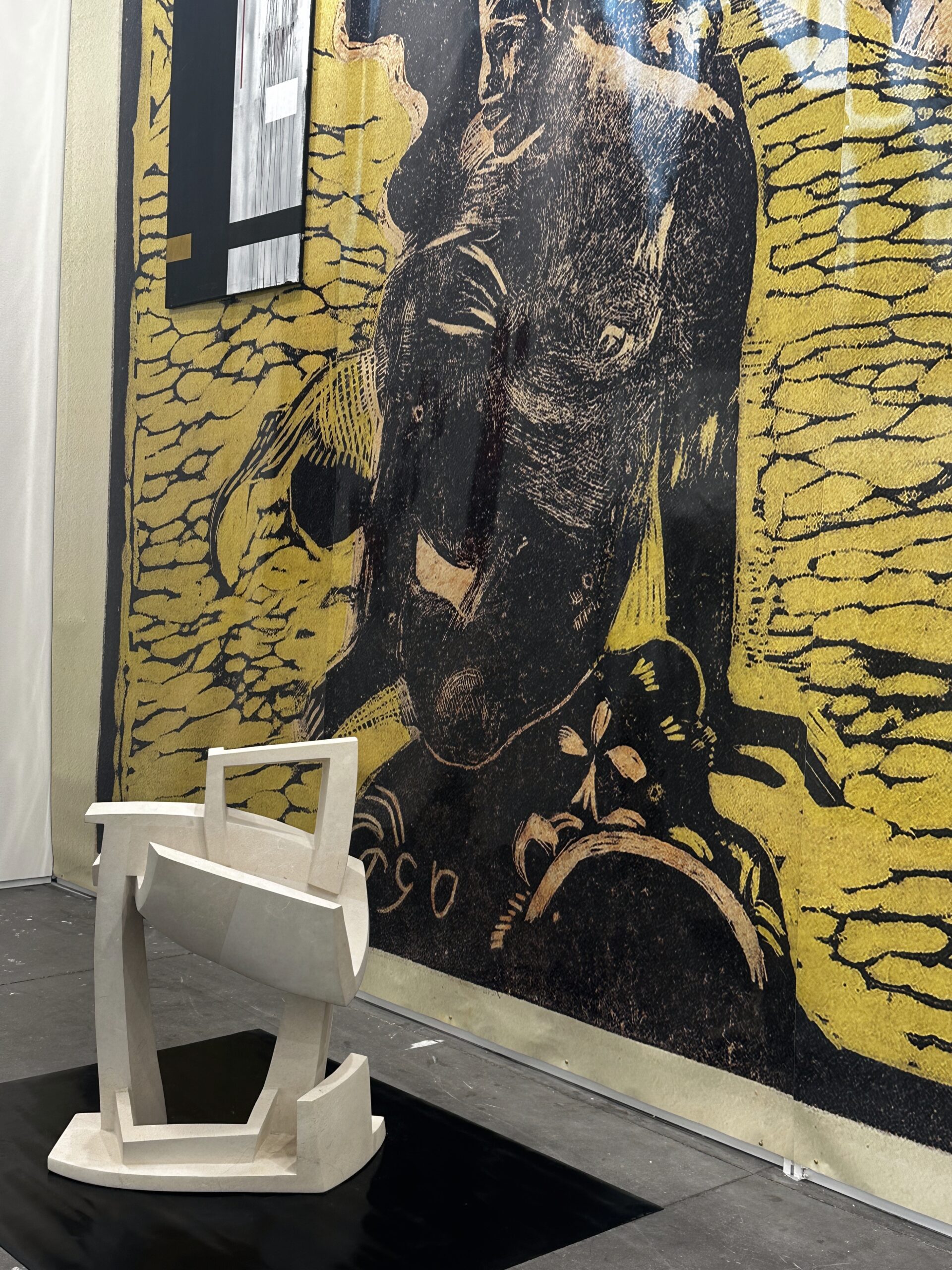 He removes material from a single block of stone to obtain the shape, and adds pigment to “eliminate” it in a space-time journey inside and outside space and shapes.
